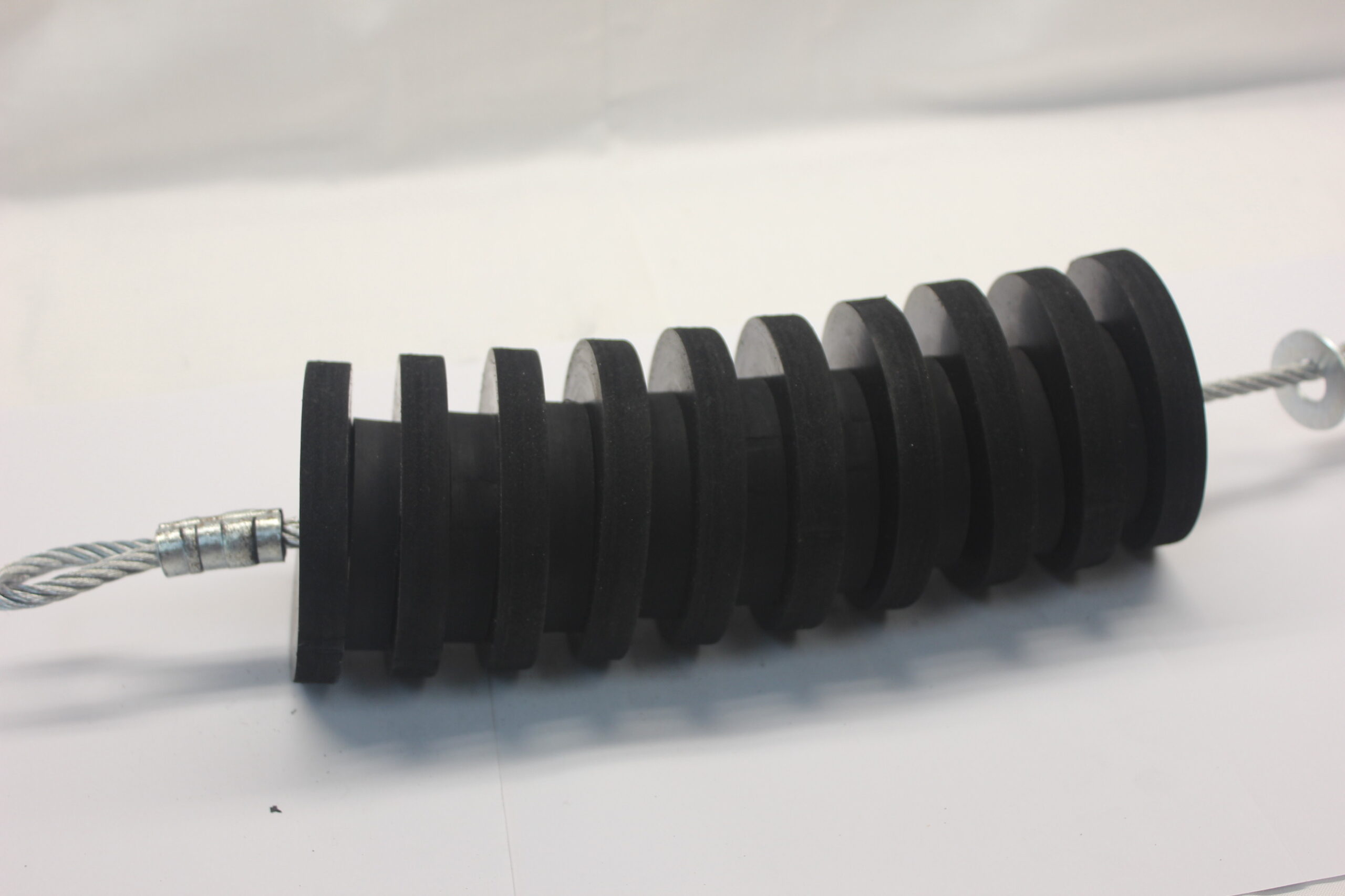 3.5” rubber duct swab. A 10” body length w/ 1/4” Steel cable.